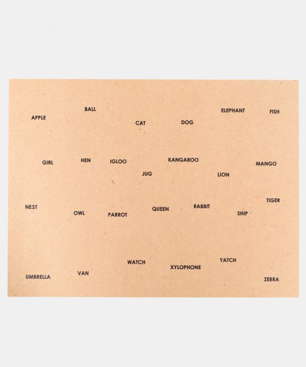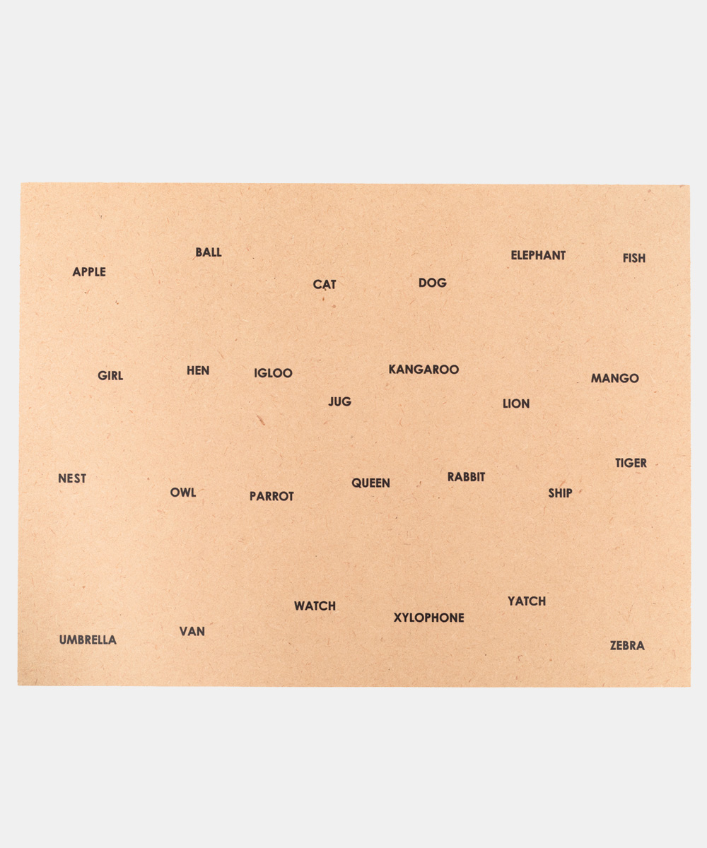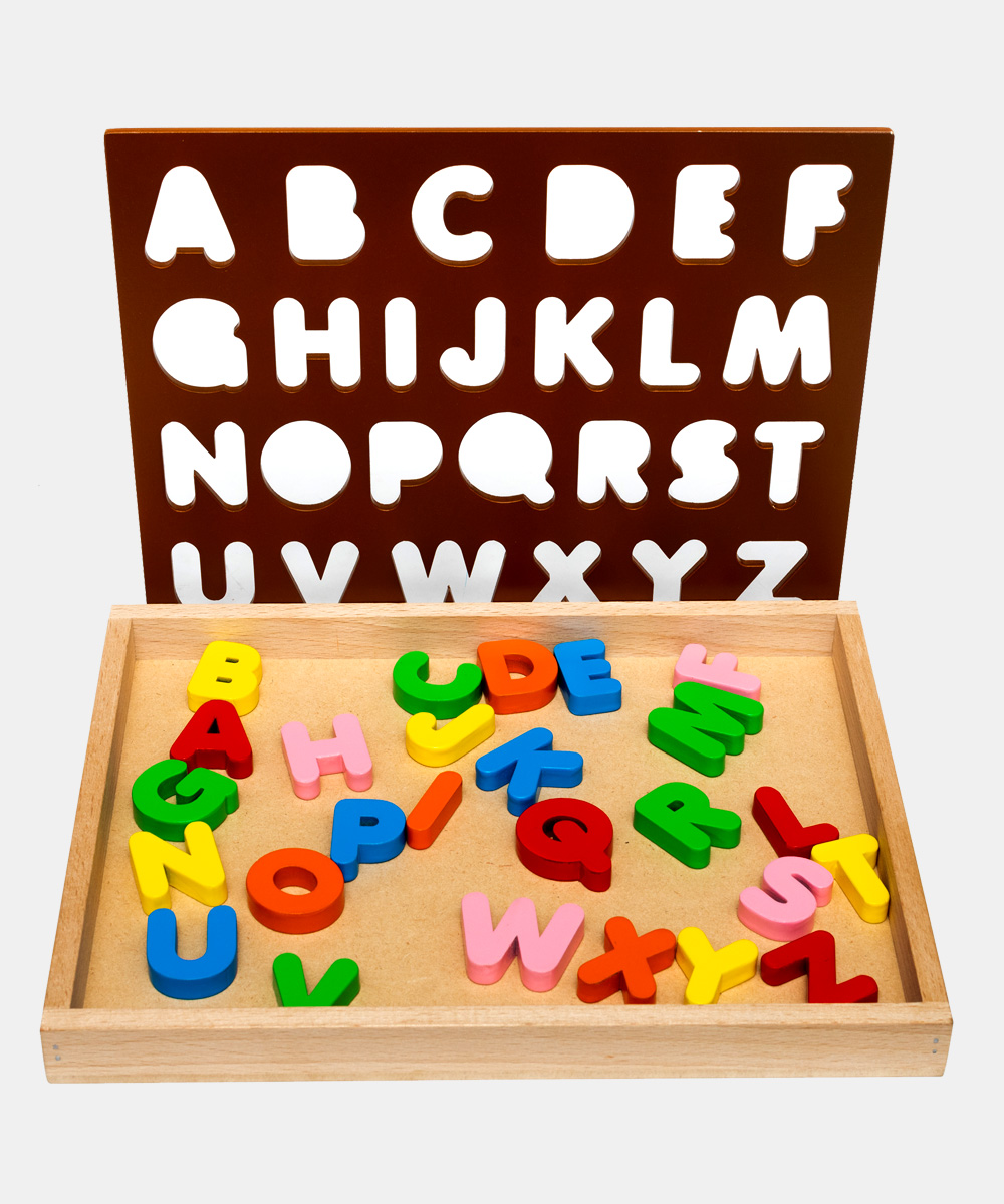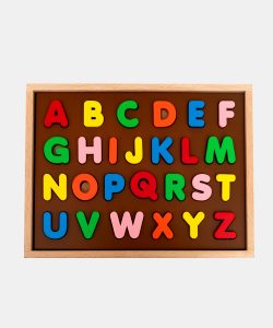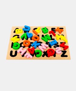 • The puzzle board consists of a wooden box, a brown stencil, wooden layer with alphabets printed on it and wooden alphabet blocks painted in bright colours.